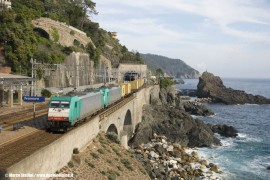 La E 483 011, in doppia con un altra E 483 di Linea, alla testa del TC La Spezia-Rho in transito a Framura sulla linea La Spezia-Genova. (18/05/2010; foto Marco Stellini / TuttoTreno)