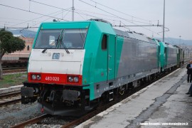 Nella foto, scattata ieri 2 aprile da Marco Stellini, la E 483 018 di Arena Ways con la nuova livrea dell’impresa piemontese: stamane la locomotiva, insieme alla gemella 020, ha effettuato l’Espresso 13371 Autozug da Domodossola ad Alessandria, il terminal italiano direttamente gestito dalle ferrovie tedesche DB.