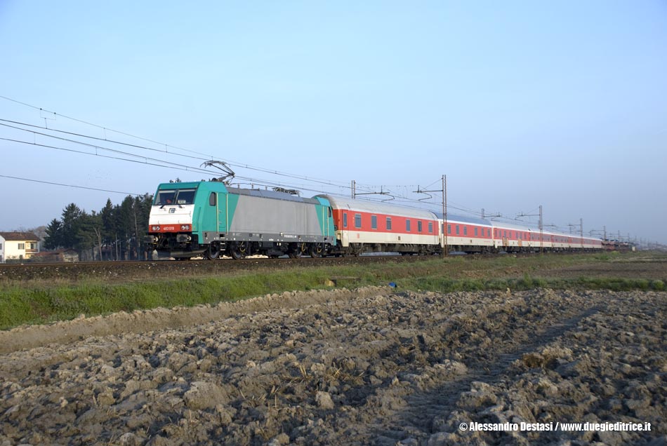 La E 483 019 con l’Espresso Autozug DB 13373 Dusseldorf-Alessandria in transito presso Vespolate, sulla linea da Novara verso la stazione di arrivo. (10/04/2010; foto Alessandro Destasi / tuttoTreno)