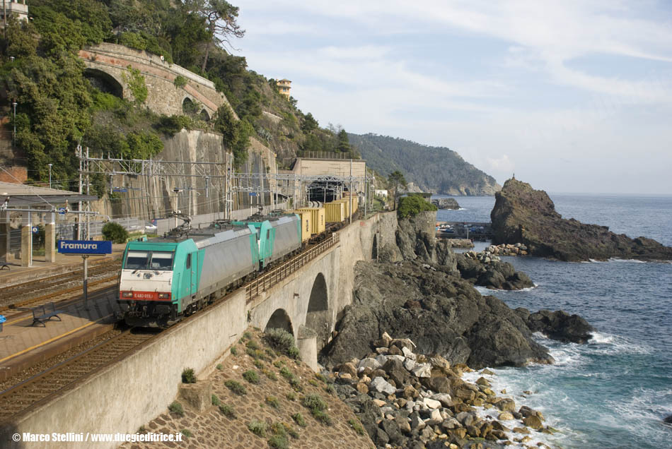 - La E 483 011, in doppia con un altra E 483 di Linea, alla testa del TC La Spezia-Rho in transito a Framura sulla linea La Spezia-Genova. (18/05/2010; foto Marco Stellini / TuttoTreno)
