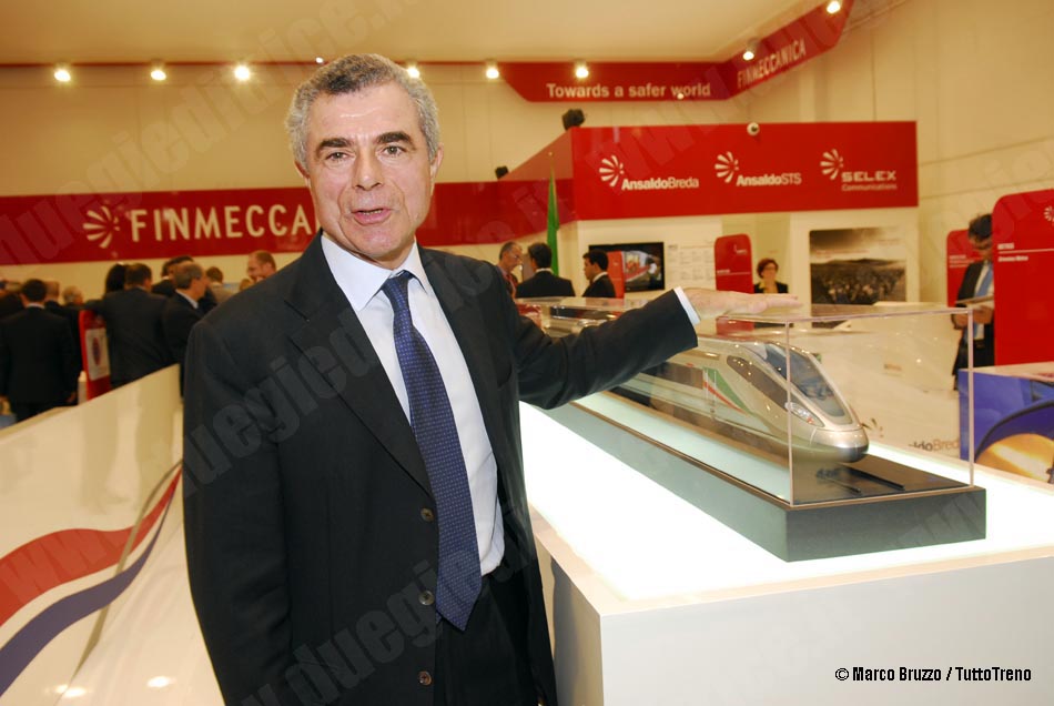 - Mauro Moretti, AD di FS, accanto alla maquette dell´ETR 1000, ovvero lo Zefiro 300 che verrà realizzato dall’ATI AnsaldoBreda-Bombardier. (Berlino, 21/09/2010; foto Marco Bruzzo / TuttoTreno)