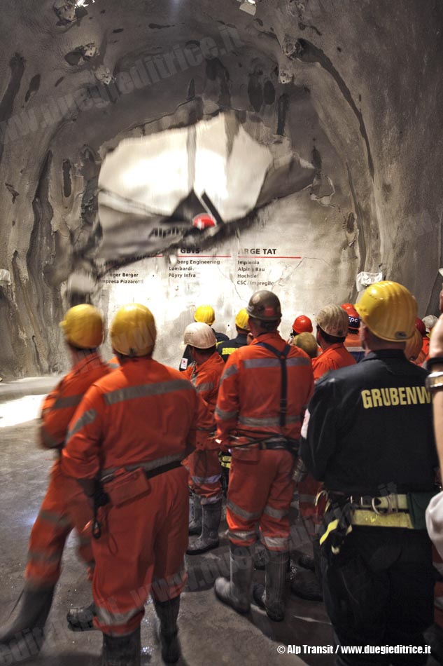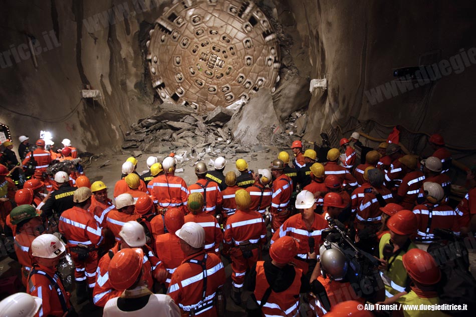 Alle 14,17 di ieri, a 30 chilometri dal portale sud e a 27 dal portale nord, è caduto l’ultimo diaframma principale nel tubo est della galleria di base del San Gottardo: alle 14.30 circa la fresatrice ha perforato gli ultimi metri di roccia avanzando da Faido verso Sedrun. La perforazione, effettuata con grande precisione, presenta una deviazione minima di 8 centimetri in orizzontale e 1 in verticale. Nella suo discorso il Consigliere federale Moritz Leuenberger ha espresso con parole cariche di emozione la sua gioia per l’importante traguardo raggiunto, affermando che la caduta degli ultimi metri di roccia rappresenta simbolicamente ciò che la politica può ottenere se tutti quanti sono pronti a dare il proprio contributo. La nuova galleria di base renderà più sostenibile la politica dei trasporti svizzera, ma anche quella europea. Renzo Simoni, Presidente della Direzione di AlpTransit San Gottardo SA, ha reso omaggio ai veri eroi di questa giornata, ossia ai numerosi minatori che giorno per giorno hanno reso possibile, con il loro instancabile impegno, questo eccezionale risultato. Nel cuore della montagna circa 200 persone, tra cui gli ospiti d’onore del Ministro dei trasporti Moritz Leuenberger, hanno assistito alla caduta dell’ultimo strato di roccia più di sei chilometri a sud di Sedrun. Circa 3500 minatori e persone coinvolte attualmente o in passato nel progetto, tra cui ingegneri, progettisti, geologi e geometri, hanno seguito l’evento su maxi schermi e festeggiato in varie località: all’officina di Sedrun, alla stazione multifunzionale di Faido, presso il portale nord di Erstfeld e al KKL di Lucerna.