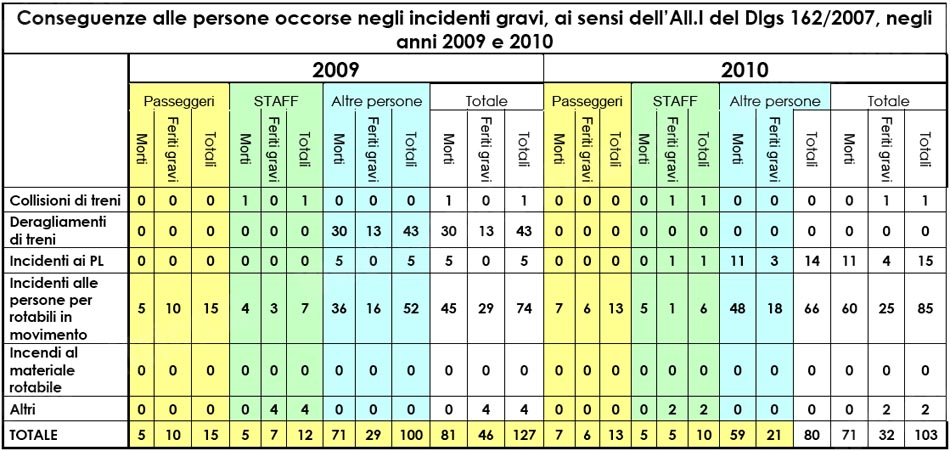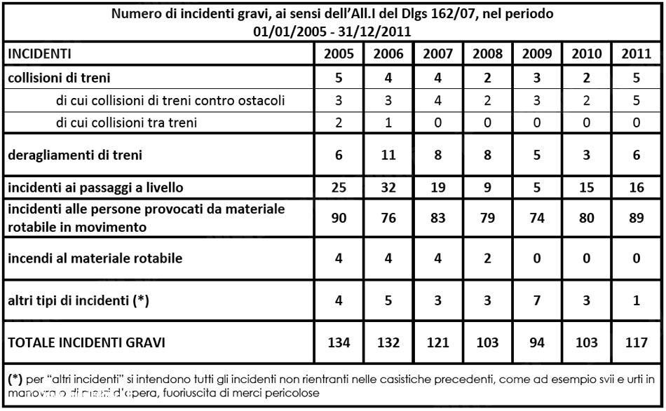 Per quanto concerne l’incidentalità si fa riferimento agli incidenti considerati “gravi” ai sensi dell’allegato I della Direttiva 2004/49/CE, recepita con il decreto legislativo 10 agosto 2007, n. 162, successivamente modificata dalla Direttiva 149/09/CE, recepita con il Decreto 10 settembre 2010 del Ministero delle infrastrutture e dei trasporti, e rientranti nelle tipologie di cui all’allegato I medesimo.