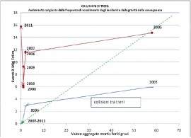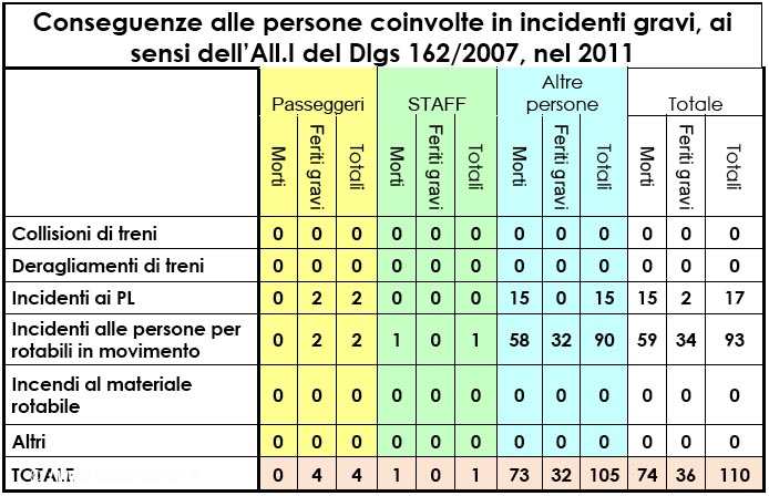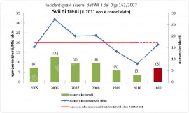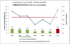 I dati del 2011 che evidenziano una crescita sono invece i “deragliamenti dei treni”, gli “incidenti ai passaggi a livello”, le “collisioni dei treni”, gli “incidenti alle persone dovuti a materiale rotabile in movimento” e di conseguenza gli “incidenti totali”.