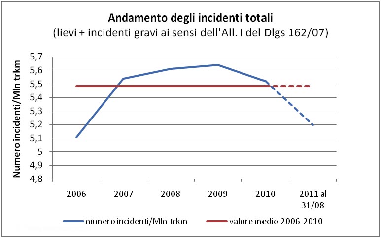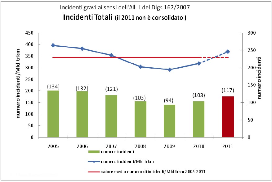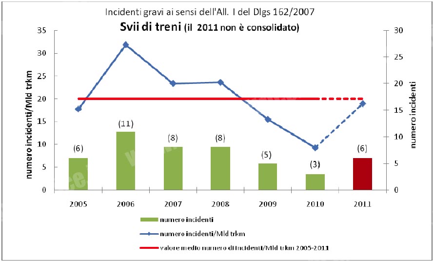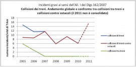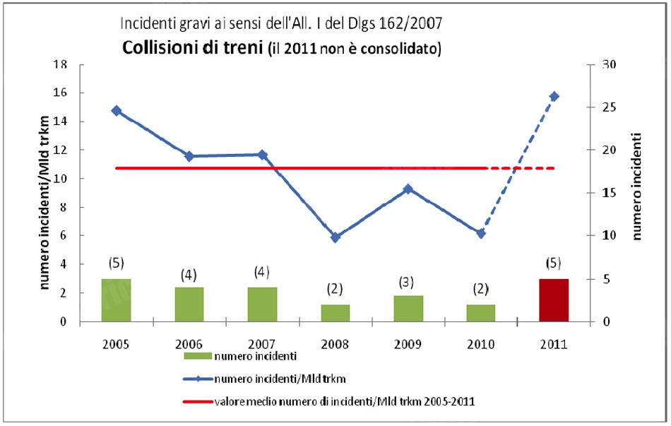 Nei grafici seguenti è riportato l’andamento degli incidenti gravi nel periodo 2005-2011, suddivisi per tipologie e in totale; per un più corretto confronto oltre al numero di incidenti in valore assoluto, rappresentato tramite istogrammi e valori in cifre, viene riportato con una linea continua anche l’andamento del numero degli incidenti rapportato ai miliardi di treni chilometro effettuati.