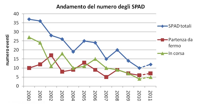Si riporta di seguito anche l’andamento degli indebiti superamenti di segnale disposto a via impedita da parte di un treno (SPAD). Tale fenomeno è strettamente collegato con le collisioni di treni essendone un precursore. La figura mette in evidenza che nel corso degli anni la numerosità di tali inconvenienti si sta riducendo anche se il 2011 ha valori leggermente superiori a quelli del 2010.