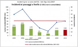 Visto l’incremento degli eventi incidentali si è comunque deciso di avviare un tavolo tecnico per verificare le problematiche emerse nel corso del 2011 negli incidenti ai passaggi a livello. Va evidenziato, comunque, il progresso del programma di soppressione dei passaggi a livello che negli ultimi 20 anni che ha fatto registrare una diminuzione del 40% del numero degli attraversamenti stradali della sede ferroviaria.