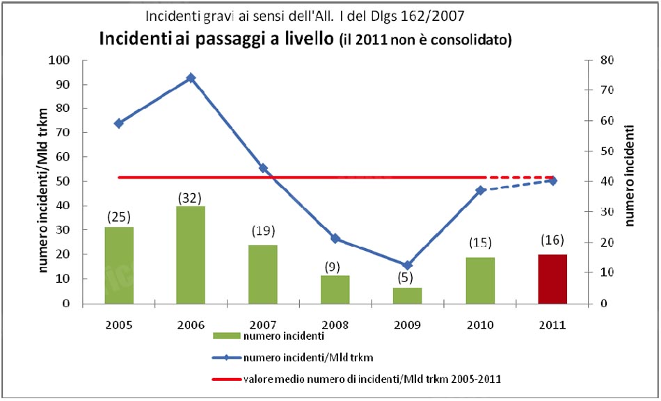 Se il dato dovesse essere confermato, si potrebbe affermare che il 2011 registra una ulteriorecrescita del numero totale degli incidenti gravi rispetto al 2010, di poco superiore al valore medio registrato nel periodo in esame. L’incremento del numero degli incidenti dipende quasi esclusivamente da indebiti comportamenti ( indebito attraversamento della sede ferroviaria o dei passaggi a livello) per i quali si stanno cercando soluzioni ad hoc come ad esempio un tavolo tecnico per la problematica dei passaggi a livello. Per non tralasciare problematiche di sicurezza che non si siano manifestate attraverso incidenti gravi, l’Agenzia utilizza comunque strumenti di supervisione che consentono di verificare se ci siano elementi di criticità in relazione ai quali sia necessario adottare provvedimenti cautelativi specifici.