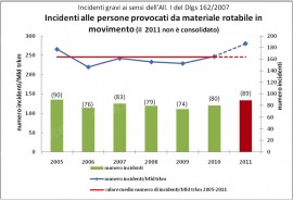 Analizzando la sola componente degli incidenti alle persone per materiale rotabile in movimento (si veda la figura seguente) si rileva che nel periodo compreso tra il 01/01/2006 e il 31/12/2011, sulla rete RFI, il numero di morti e di feriti gravi ha avuto un andamento altalenante e che il 2010 ha registrato valori pressoché costanti rispetto al 2009 ma che il 2011 ci fornisce il valore minimo del periodo in esame. Tali valori sono il risultato dell’attenzione posta sul fenomeno dall’Agenzia e dal Gestore dell’Infrastruttura, delle norme varate e delle limitazioni imposte per eliminare i rischi collegati all’esecuzione dei lavori sull’infrastruttura in presenza di circolazione dei treni.
