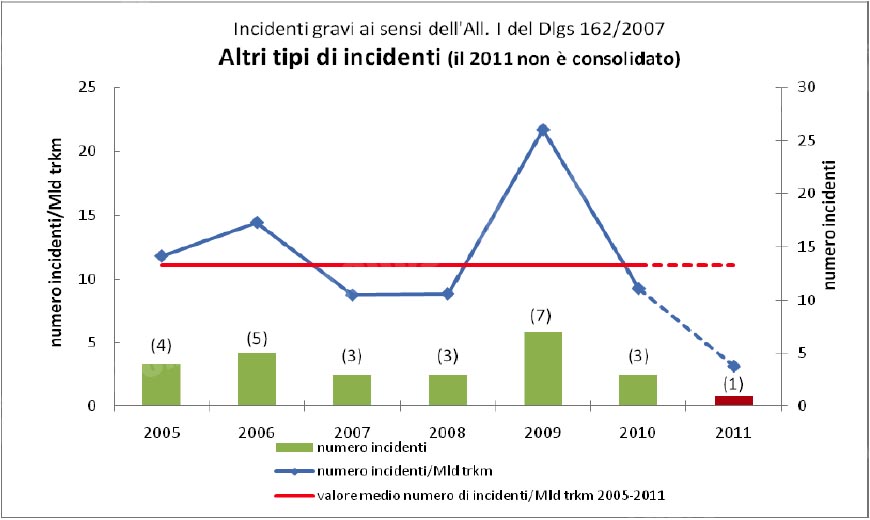 Tra gli “altri tipi di incidenti” nel 2011 è stato registrato un solo evento, un valore inferiore al 2010 ed all’intero periodo in esame. Si tratta però di un evento di particolare rilevanza: lo svio del materiale 485, occorso a Napoli centrale il 31/07. In questa categoria sono inseriti tutti gli incidenti ferroviari che non rientrano in nessuna delle altre categorie di incidenti, come ad esempio lo svio o la collisione di un mezzo d’opera o di una manovra o la fuoriuscita di merci pericolose. Quindi vengono inseriti in questa categoria anche i dati relativi a una parte degli eventi connessi alla problematica della sicurezza dei cantieri e delle manovre, un’altra parte dei quali rientra invece negli “incidenti alle persone provocati da materiale rotabile in movimento” nella quale è stato coinvolto il personale ferroviario o operante per conto delle ditte appaltatrici.