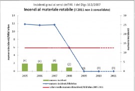 Dalla figura seguente si può rilevare come anche nel 2011 non si siano registrati incendi al materiale rotabile, non causati da atti volontari, che abbiano superato le soglie in termini di conseguenze stabilite dall’allegato I del decreto legislativo 10 agosto 2007, n. 162.