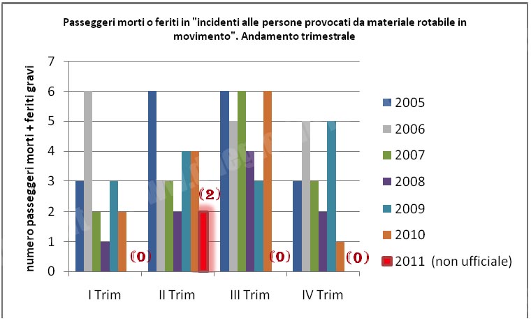 In considerazione della rilevanza assunta della problematica negli anni precedenti (si tratta infatti dell’unica area nella quale si sono avuti decessi o feriti gravi tra i passeggeri nel periodo osservato), nel grafico seguente l’andamento aggregato dei decessi (morti) o dei ferimenti gravi dei “passeggeri” in conseguenza di “incidenti alle persone provocati da materiale rotabile in movimento” nel periodo 2005-2011 è stato suddiviso in trimestri. Il confronto dei dati mostra che nel 2011 si è avuta una riduzione dei morti e feriti gravi (due ferimenti gravi avvenuti nel II trimestre) di tale tipologia di incidenti.