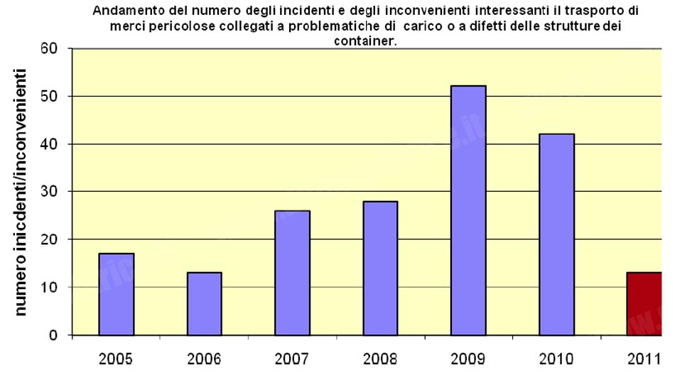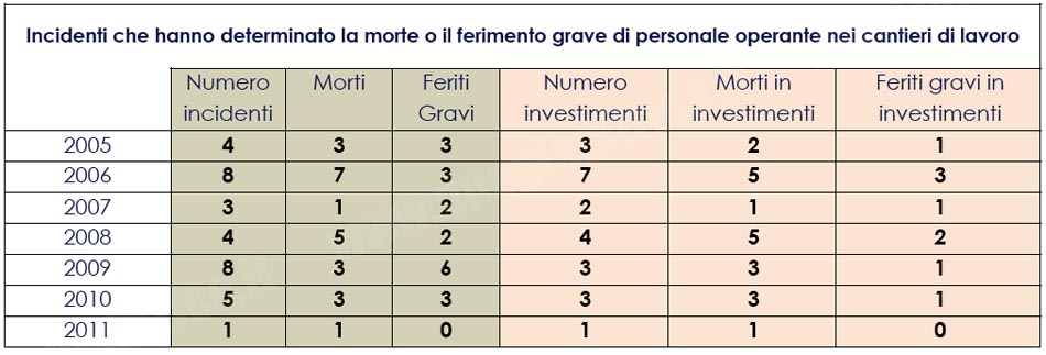 Nella tabella seguente si riporta il numero non consolidato degli incidenti gravi occorsi nel 2011, messo a confronto con il numero degli incidenti occorsi negli anni precedenti.