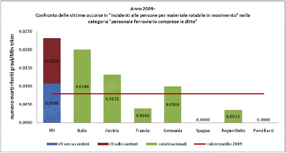 Nel 2010 per verificare i valori di incidentalità nei cantieri di lavoro registrati sulla rete gestita da RFI è stato fatto un confronto tra i dati riportati negli Indicatori Comuni di Sicurezza di alcuni paesi europei, riferiti al 2009. Poiché gli Indicatori Comuni di Sicurezza non sono stati calcolati per fornire questo dato, l’analisi è stata circoscritta ai dati che avevano una maggiore attinenza con questa problematica, quindi sugli incidenti alle persone provocati da materiale rotabile in movimento che hanno avuto come conseguenza la morte o il ferimento di personale ferroviario comprese le ditte; si precisa che in questa categoria non rientrano solo gli incidenti nei cantieri ma anche, ad esempio, gli investimenti del personale durante le operazioni di manovra.