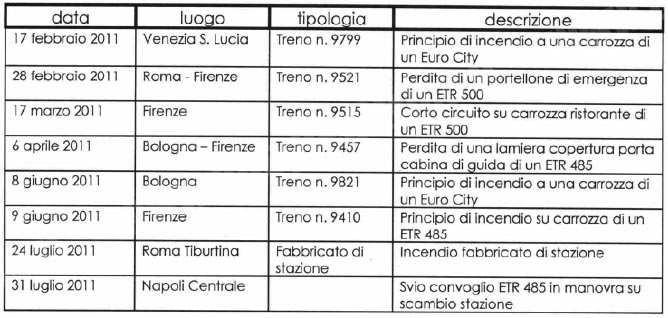 Nel corso del 2011 si sono verificate 120 anormalità a treni Eurostar, delle quali alcune hanno avuto come conseguenza piccoli incidenti. Le anormalità sono collegate principalmente a difetti del materiale rotabile e sono riconducibili a differenti problematiche come quelle di guasti alle porte, al distacco di componenti dal materiale rotabile, agli assi bloccati, al riscaldamento boccole fino ad arrivare allo svio del materiale ETR occorso a Napoli il 31 luglio 2011.