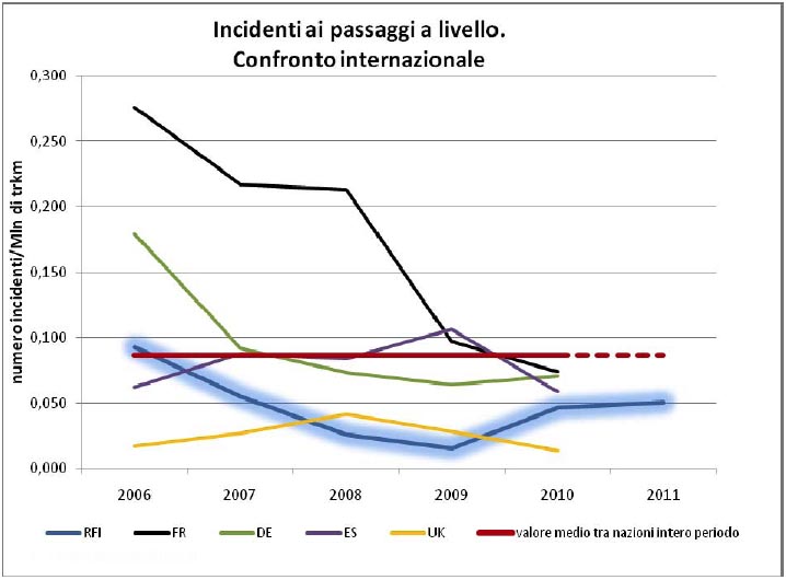 Si può rilevare che nonostante la crescita del numero di eventi incidentali, i valori registrati sull’Infrastruttura Nazionale sono inferiori alla media dei paesi europei utilizzati per il confronto ed ai valori registrati in ogni singola nazione ad eccezione del Regno Unito. Il numero degli incidenti ponderato per i volumi di traffico ferroviario non è lo strumento migliore per confrontare tali performance in quanto dovrebbero essere analizzati altri fattori quali il numero dei passaggi a livello, il traffico stradale, ecc. ma fornisce un quadro seppur approssimativo di riferimento.