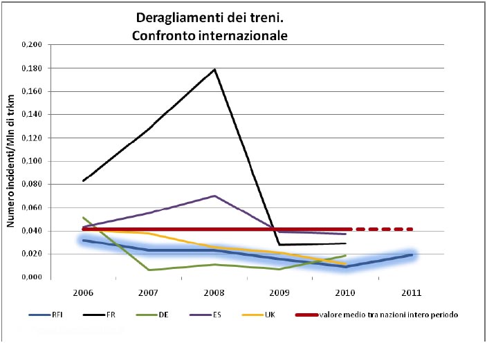 Dal confronto si evidenzia che le performance registrate negli anni 2010 e 2011 sulla rete RFI sono in linea con i valori medi degli altri paesi europei, ad eccezione degli incidenti provocati a persone da rotabili in movimento e del totale del numero di incidenti occorsi.