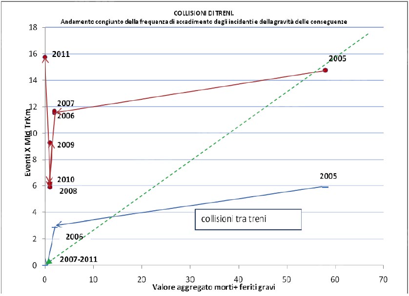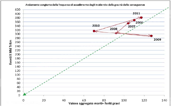 L’ultimo aspetto che si ritiene opportuno analizzare riguarda la verifica delle performance registrate in Italia rispetto agli obiettivi cogenti in ambito nazionale. Il DPR 753/80 all’articolo 8 stabilisce che “nell’esercizio delle ferrovie si devono adottare le misure e le cautele suggerite dalla tecnica e dalla pratica atte ad evitare sinistri”, quindi una adozione progressiva di provvedimenti suggeriti dall’esperienza o resi disponibili dall’evoluzione tecnologica che portino il sistema a tendere allo “zero” sia dal punto di vista degli incidenti che delle conseguenze degli stessi. La figura successiva si ispira a tale principio (tendere a “zero”) e descrive l’andamento congiunto della frequenza di accadimento degli incidenti gravi e delle conseguenze degli stessi. Il tendere a valori nulli di incidentalità si sostanzia in una tendenza ad approssimarsi all’origine degli assi cartesiani (lo zero) rappresentata da una linea verde tratteggiata.