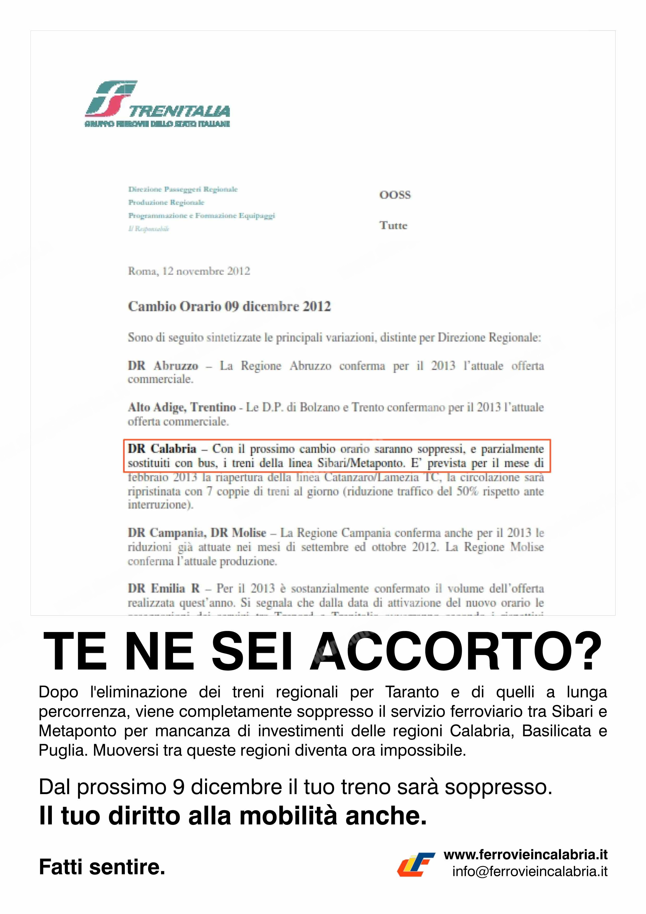 Dal giorno 9 dicembre 2012 sulla tratta RFI tra Metaponto (MT) e Sibari (CS) i servizi ferroviari verranno sostituiti da autobus: questo comporterà un aumento del tempo di percorrenza tra i 5 e i 20 minuti (90 contro 70/85), traffico stradale permettendo. Si tratta del primo pezzo della linea Jonica a perdere il servizio passeggeri facendo così entrare le due regioni nella lista 2012 delle regioni italiane che non sostengono la ferrovia.
