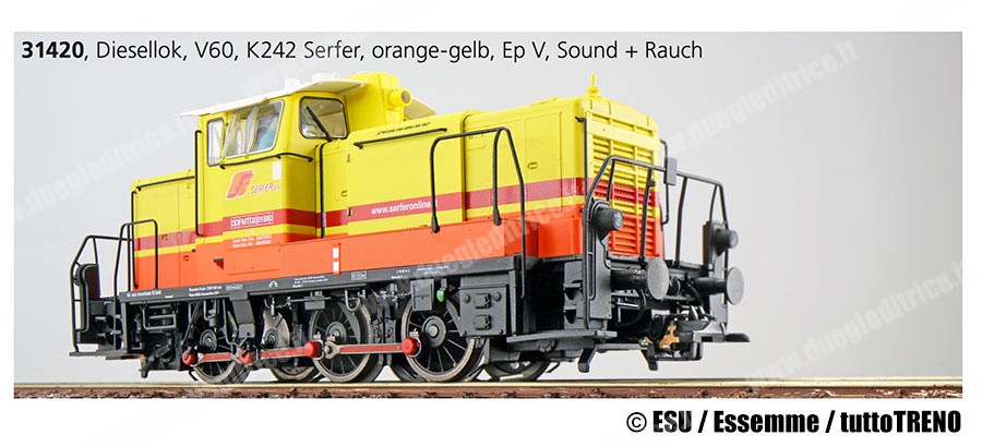 Annunciata con una foto in catalogo di un campione di pre-produzione verniciato e decorato la V60 ex DB acquisita usata dalla società italiana specializzata in manovre ferroviarie Serfer di Genova (a partecipazione FS, ora confluita in Mercitalia Shunting). Il modello ESU, ricordiamolo, oltre al dettaglio da supermodello e alla motorizzazione ad alte prestazioni, si contraddistingue per una dotazione digitale di ultimissima generazione che include tutte le caratteristiche di un modello moderno, dalla riserva di energia (per un funzionamento a prova di perdita di contatto temporanea) fino al gancio digitale, passando per effetti luce completi, fumogeno, e pure un impianto suono di grande suggestione. Sarà realizzata in esclusiva per Essemme di Milano, che ne ha curato la produzione in serie limitatissima. Da prenotare! A cura della redazione modellismo